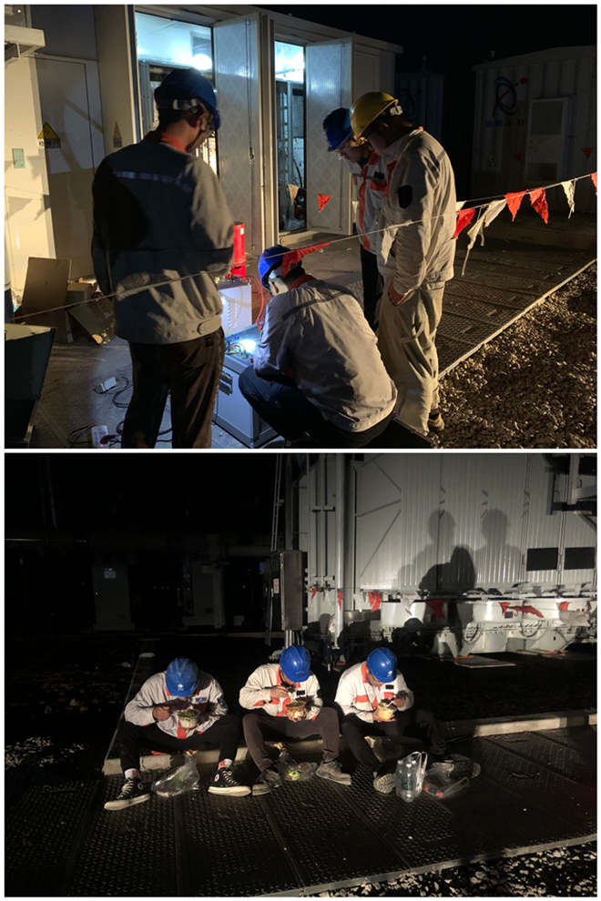 據悉,電纜耐壓試驗一相必須做滿一小時,做完兩根電纜耐壓試驗最少需要6小時。這意味著今晚將是個不眠之夜,面對這種情況,青年突擊隊隊員王程龍主動請纓,帶著王磊、祁明智、董毓帶上準備好的試驗設備二話不說奔去升壓站。升壓站附近環(huán)境惡劣,沒有路燈,只能用手電筒照明,且蚊蟲較多。在勘查過場地、熟悉工作任務需求、了解了有關注意事項后,他們熟練快速的連接調試好設備,開始做起了試驗。為了防止試驗過程中意外出現,幾人一直盯著設備,絲毫不敢松懈,一直鏖戰(zhàn)至凌晨5點,才順利完成試驗。(盧正遷、董毓)