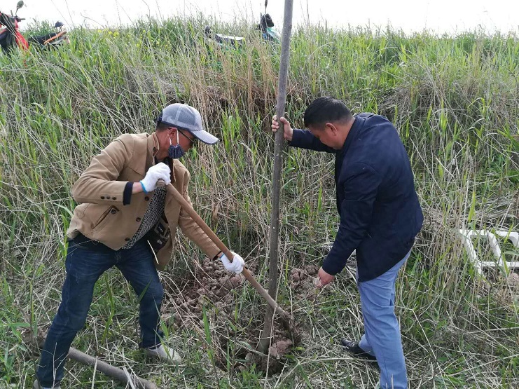 大家下午一點三十出發(fā),每人帶上鐵锨或者鐵楸,前往目的地。全體員工都相互協(xié)作,四人一組搬運樹苗,填土栽植,經(jīng)過兩天的勞動完成了二百三十三畝土地共五百四十棵樹苗的栽植任務(wù)。