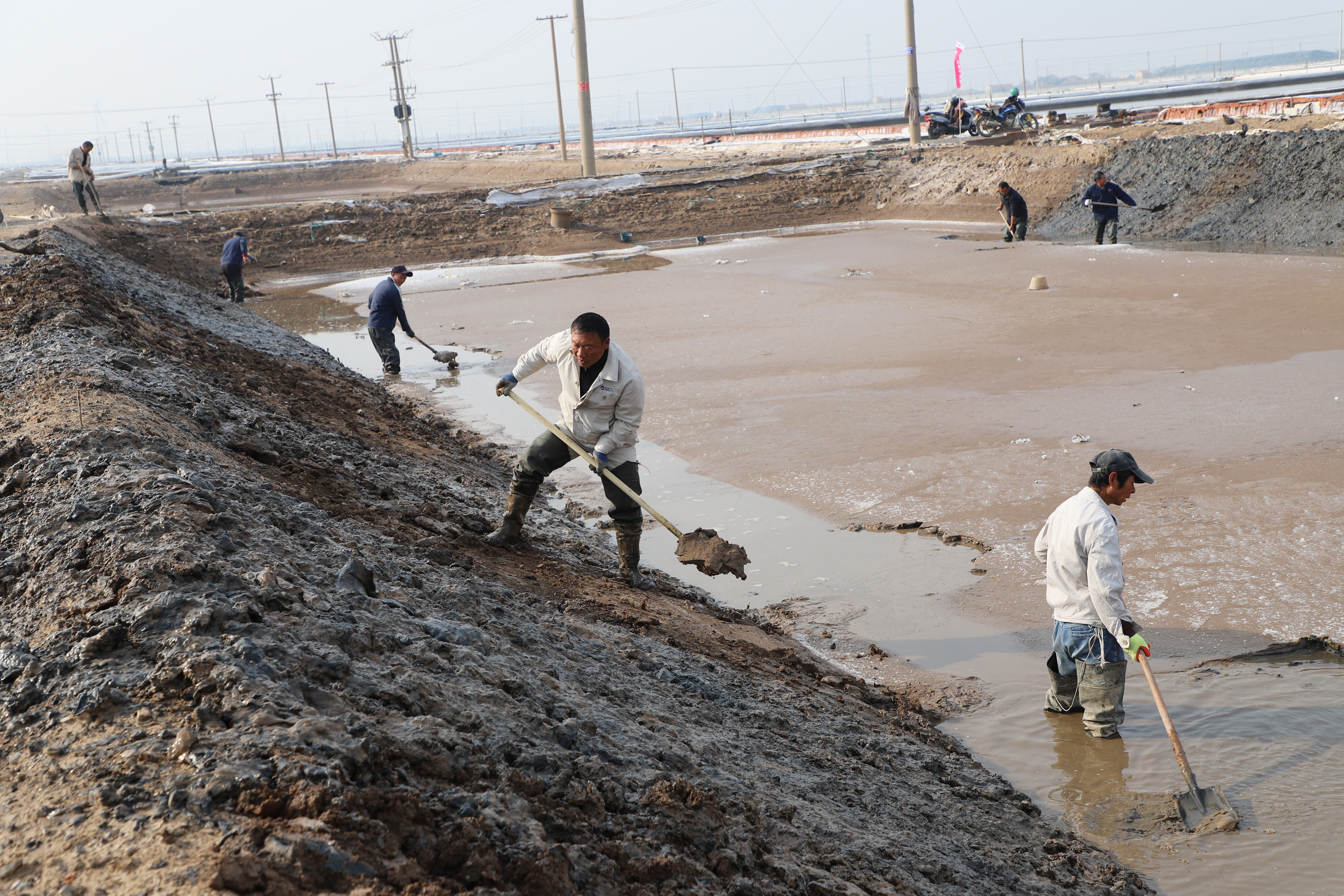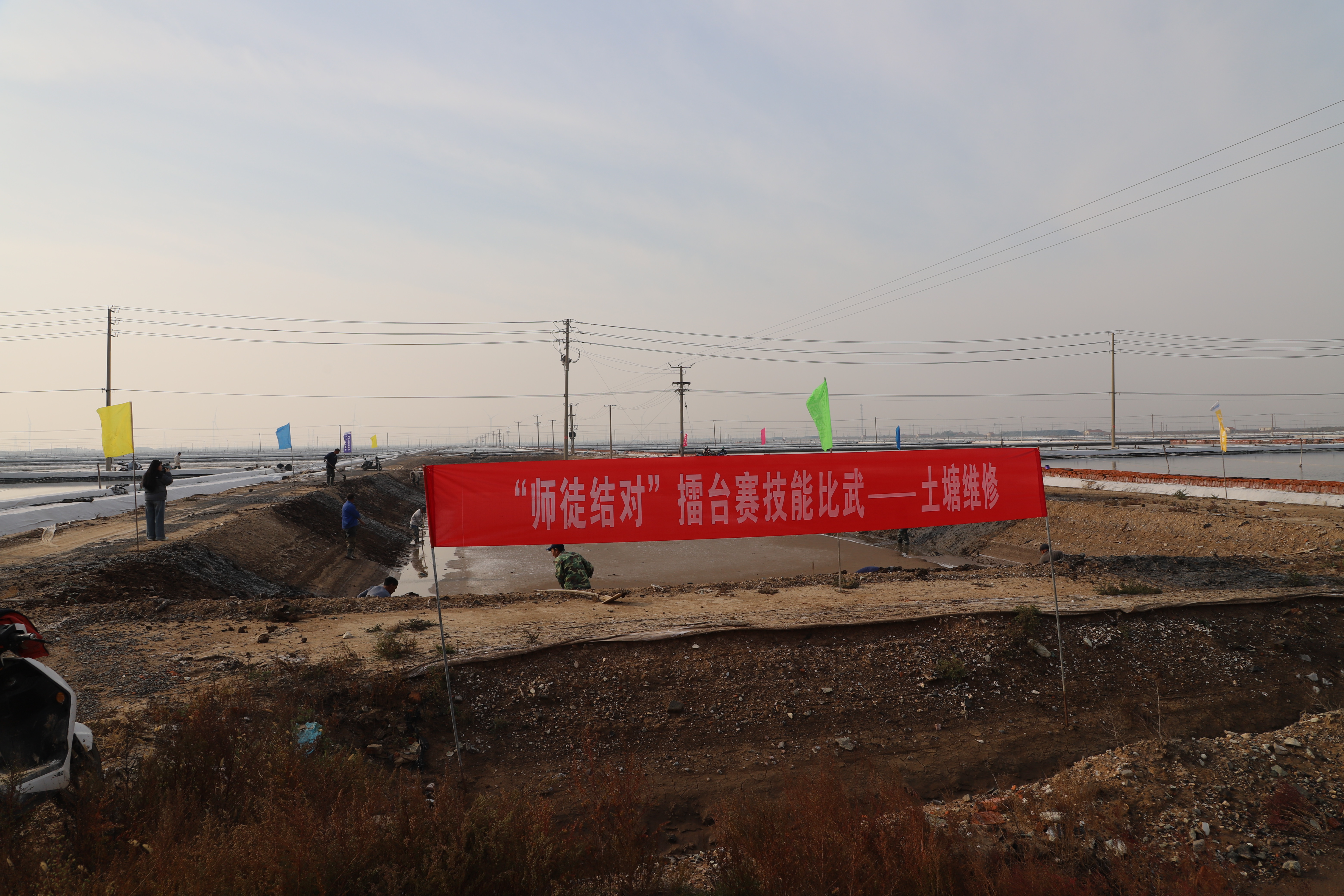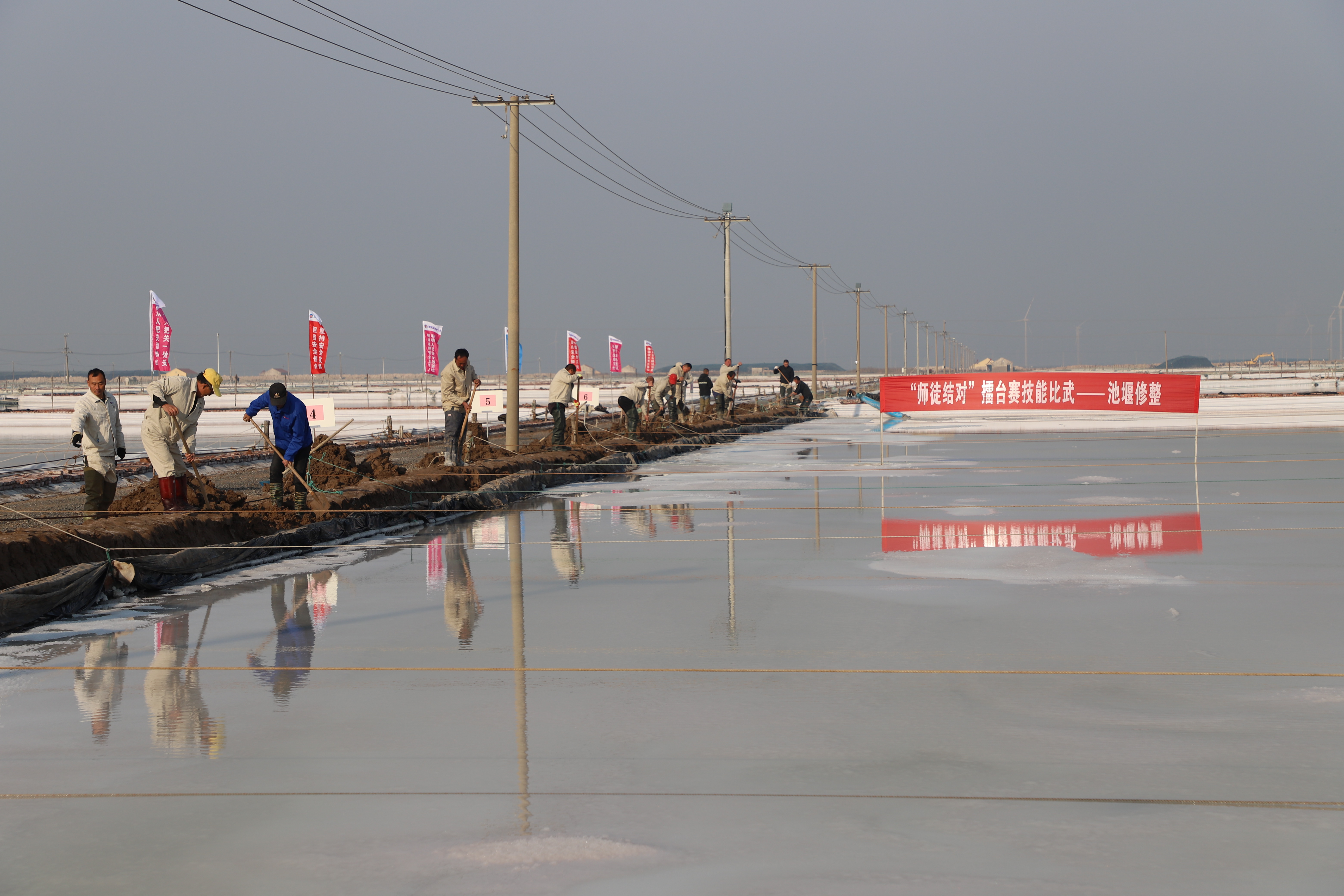 寒冬時(shí)節(jié),暖陽(yáng)之下,鹽廩之旁,曬得黝黑的鹽場(chǎng)產(chǎn)業(yè)工人們按照競(jìng)賽的考核標(biāo)準(zhǔn),做熟泥、打堰墻、做堰頂,護(hù)埝頂、夯埝坡、清塘底,由此,見(jiàn)證了一場(chǎng)技能比拼的盛會(huì)。
