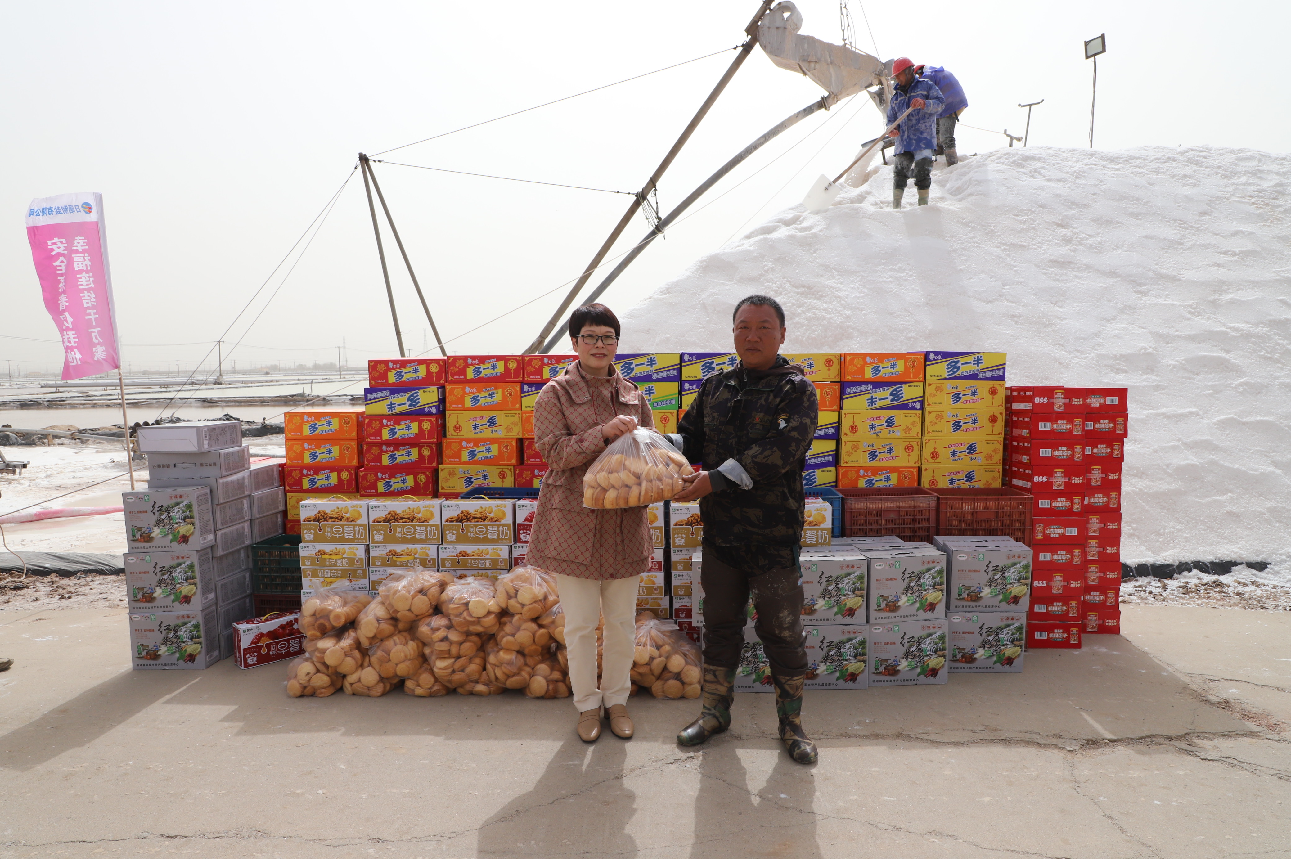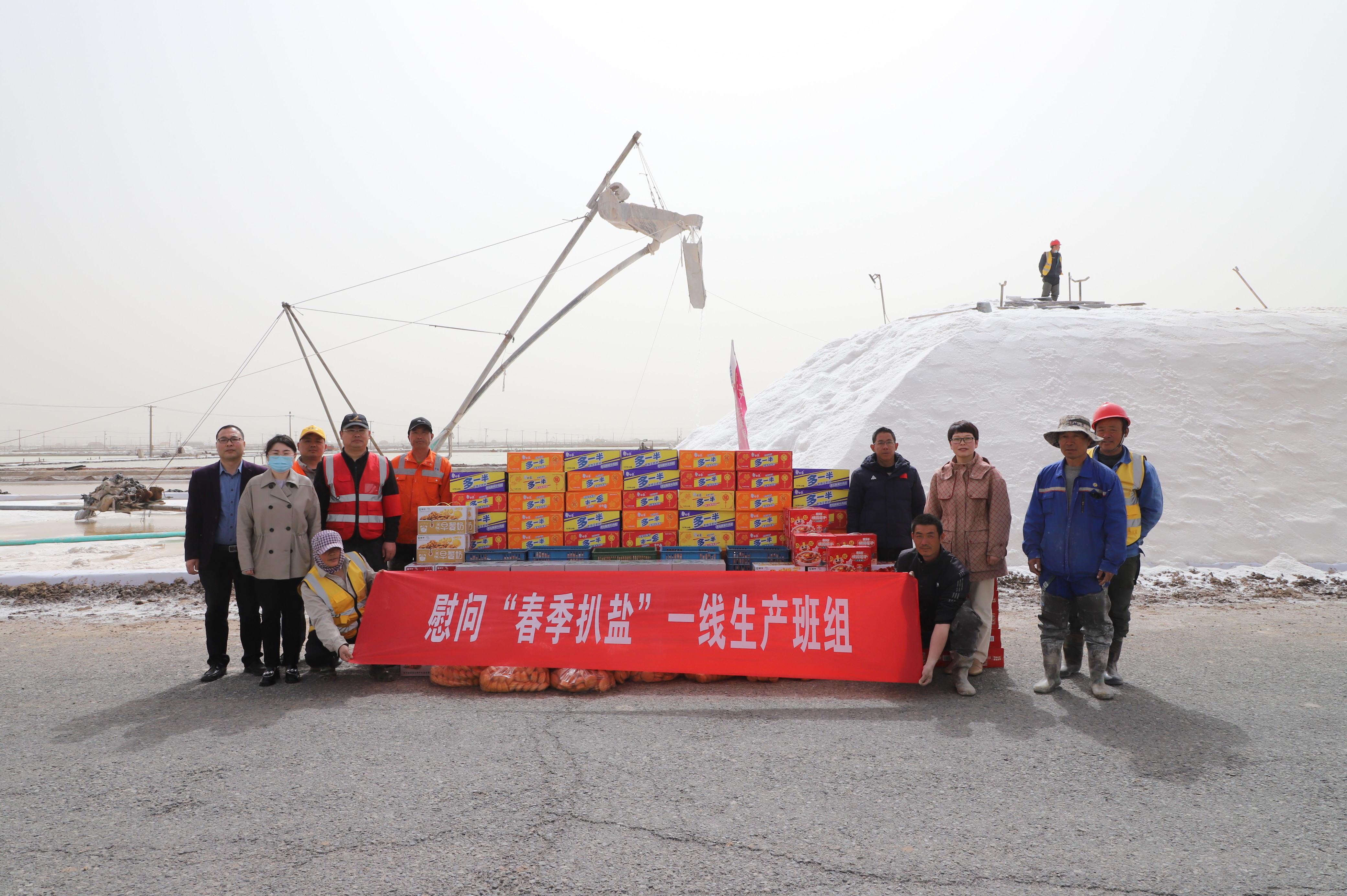 “你們辛苦了,我代表公司來看望大家?!痹谛潞泳虐嗯c埒南九班,王宏與扒鹽現(xiàn)場職工握手問好,感謝他們在過去的一年為日曬制鹽公司的原鹽生產(chǎn)所付出的辛勤努力,叮囑他們一定要落實落細(xì)扒鹽生產(chǎn)措施,增強責(zé)任感和警覺性,嚴(yán)格執(zhí)行各項規(guī)章制度,切實保障扒鹽期間的安全生產(chǎn),并送上雞蛋、八寶粥、方便面、牛奶等物品。