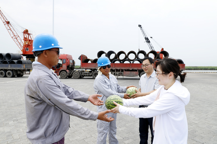 入伏以來,氣溫持續(xù)攀升,五灌河碼頭裝卸工作也迎來了夏季高溫的“烤驗”。為做好高溫酷暑期間的防暑降溫工作,確保職工工作安全和身心健康,7月25日,灌西工會一行到宵洋五灌河碼頭為堅守在崗位上奮戰(zhàn)的碼頭工人送去關(guān)懷和問候。