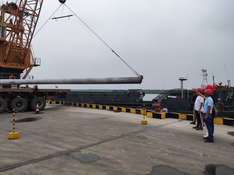 管樁的裝卸和別的貨物相比,安全風(fēng)險更大,所以在裝卸管樁時,宵洋管理人員要深入現(xiàn)場,緊盯嚴(yán)管,對管樁的重要環(huán)節(jié),一邊講解注意事項,一邊手勢指揮,塔吊師傅小心翼翼,嫻熟地拔弄著操作手把,通過塔吊搬運,五噸的管樁在半空中調(diào)試到最佳位置,最后平穩(wěn)著落,從船艙吊起的管樁,運送到貨車上,艙內(nèi)的三名工人,齊心協(xié)力,配合得相當(dāng)默契,掛在吊機上的管樁,看似簡單的一鉤一掛,不僅要調(diào)整管樁擺放角度,還要檢查鋼繩是否牢固,為了安全起見,在船艙和管樁之間,又架起了一層防護網(wǎng),防止掛鉤工摔倒跌落,采取一系列防范措施,確保萬無一失。經(jīng)過一天的忙碌,望著遠去車輛,每當(dāng)圓滿完成當(dāng)天卸管樁任務(wù)后,工人們憨厚老實臉上,露出了滿意的微笑,這就是我們宵洋工人搬卸管樁情景的真實寫照!(宵洋物流公司胡秀同)