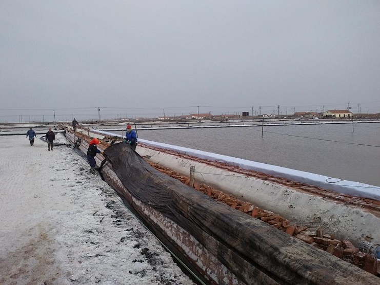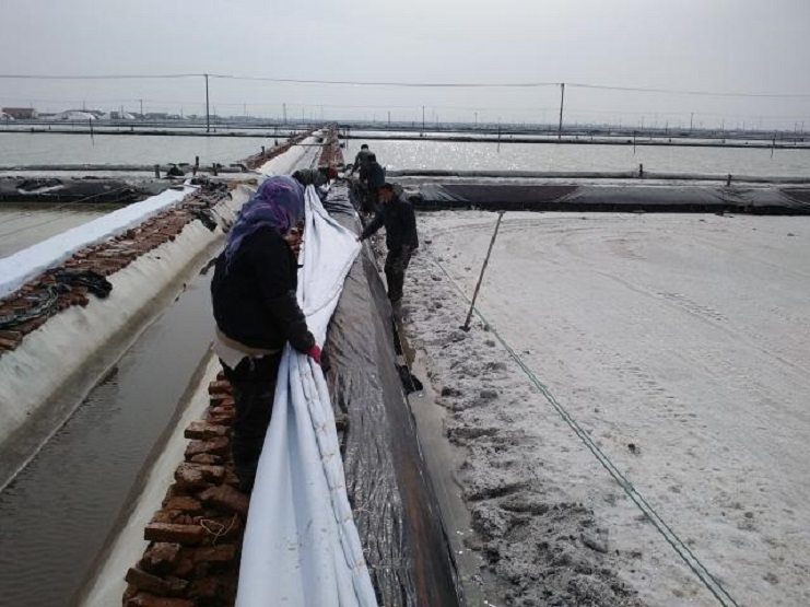 新河制鹽分公司為了盡快改善食用鹽基地面貌,減少池埝上固化紅磚風化,沙塵落入鹽池內,對池鹽的污染,近期組織分公司職工,對基地塑池的紅磚固化池埝進行處理,先用黑塑布把池埝重包一遍,然后再用土工布苫好。有效地減少了雜物落入池鹽中,為產合格食用鹽提供了良好生產環(huán)境。(圖為職工們正在苫蓋紅磚固化池埝。) (唐廣付)