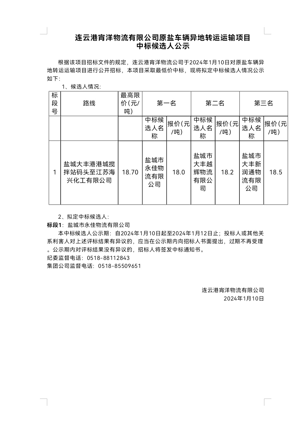 連云港宵洋物流有限公司原鹽車輛異地轉(zhuǎn)運運輸項目中標(biāo)候選人公示
