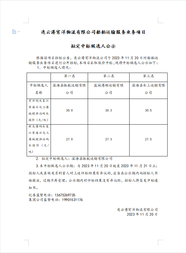 連云港宵洋物流有限公司船舶運(yùn)輸服務(wù)業(yè)務(wù)項(xiàng)目擬定中標(biāo)候選人公示