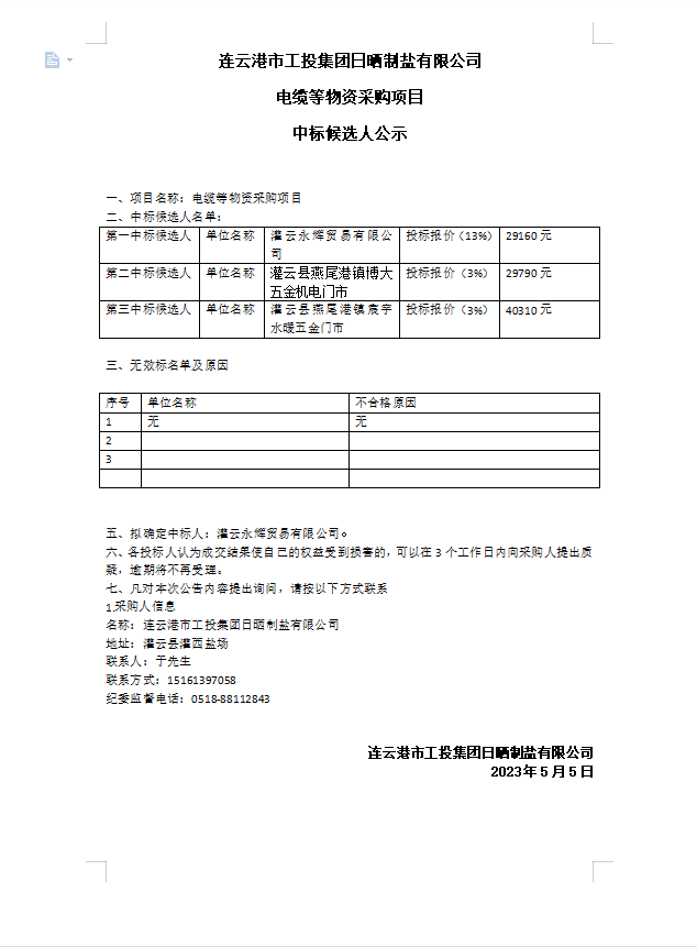連云港市工投集團(tuán)日曬制鹽有限公司電纜等物資采購項目中標(biāo)候選人公示