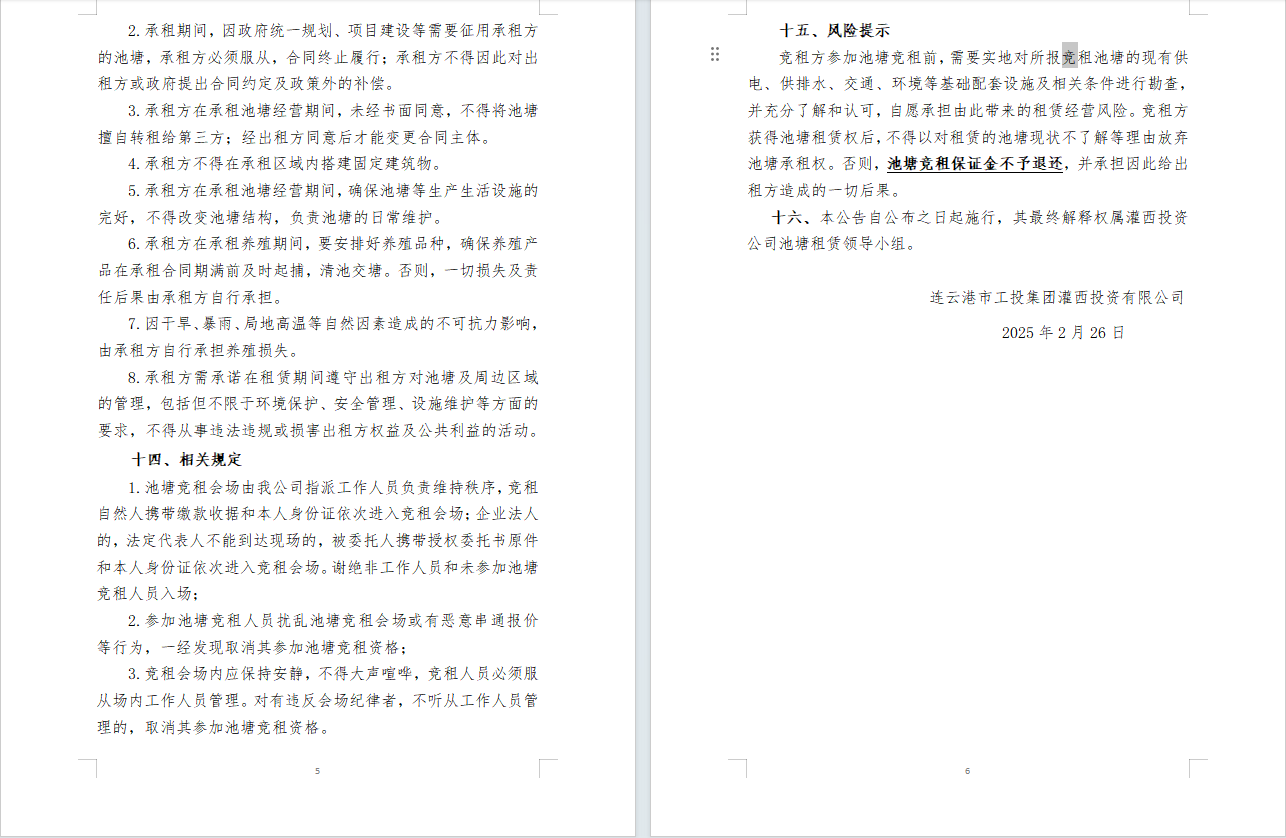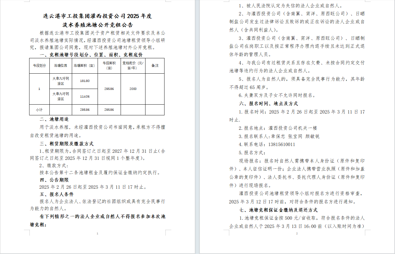 連云港市工投集團(tuán)灌西投資公司2025年度淡水養(yǎng)殖池塘公開競(jìng)租公告