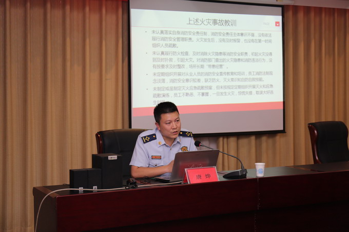 為規(guī)范消防安全管理,提高公司干部職工消防安全意識和火災應急處置能力,7月7日,我公司邀請連云區(qū)消防隊副隊長唐燁,在三樓會議室開展消防安全知識培訓。公司董事長、黨委書記、總經理朱桂玉,黨委副書記、工會主席曹開明,副總經理何啟明,總經理助理李忠祥,各單位、車間、部室人員參加了培訓。