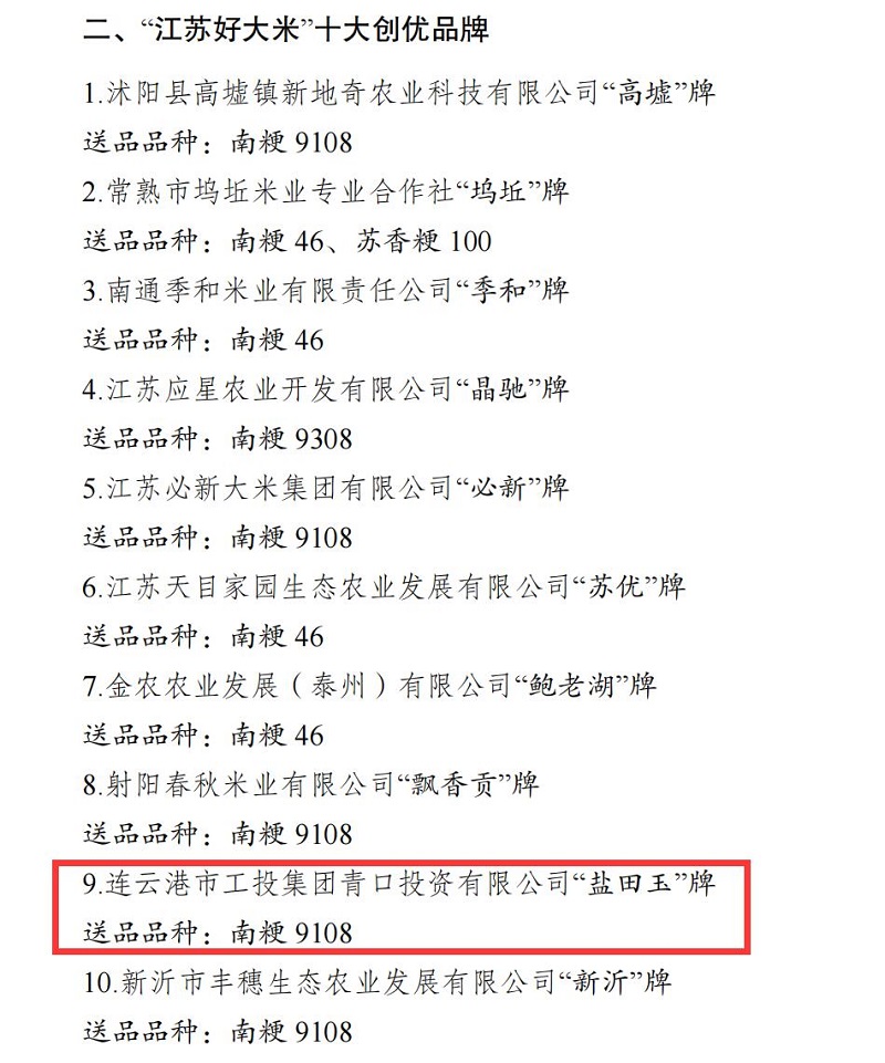 近日,第八屆江蘇好大米評(píng)鑒推介結(jié)果公布,“鹽田玉”品牌再創(chuàng)佳績(jī),榮獲“江蘇好大米”十大創(chuàng)優(yōu)品牌。