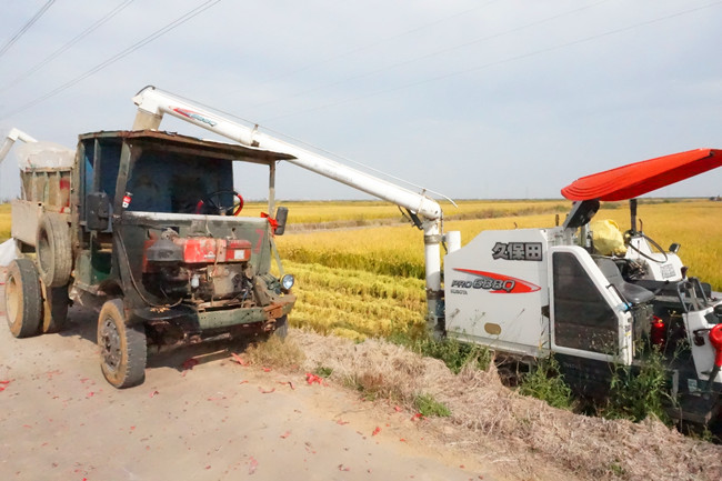 10月25日,天氣晴好。四臺(tái)收割機(jī)伴隨著喜慶的爆竹聲陸續(xù)開(kāi)進(jìn)稻田,拉開(kāi)了大新農(nóng)場(chǎng)萬(wàn)畝稻田開(kāi)鐮序幕。黨委委員、副總經(jīng)理周緒祥在現(xiàn)場(chǎng)查看指揮。