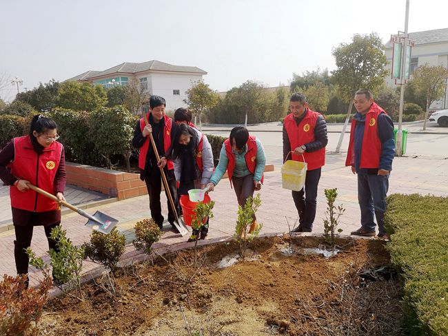 會后,服務中心與社區(qū)一行人身穿紅馬甲迅速投入到緊張的植樹活動中,大家三五人一組,分工協(xié)作、配合默契,扶起樹苗、揮鍬鏟土、培實新土,齊心協(xié)力種下一株株樹苗,呈現(xiàn)出一派火熱的勞動場景。