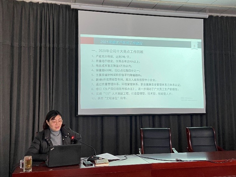 會上,公司副總經(jīng)理王爽芳總結(jié)了2020年公司十大亮點工作,部署2021年生產(chǎn)重點工作。公司總經(jīng)理助理李洋總結(jié)了2020年生產(chǎn)車間管理工作,提出車間2021年“5S”管理目標。