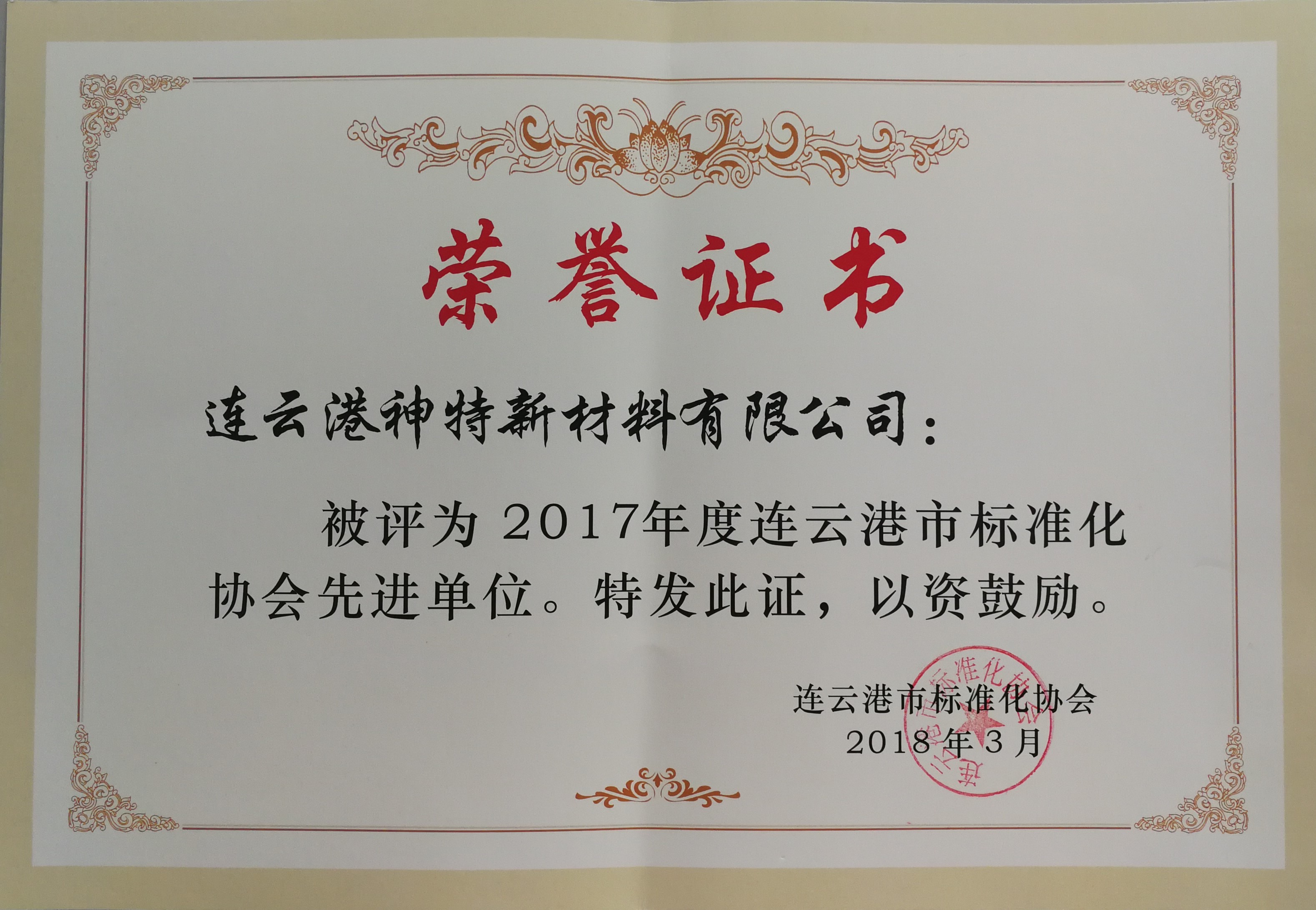 神特公司獲2017年度連云港市標(biāo)準(zhǔn)化協(xié)會(huì)先進(jìn)單位