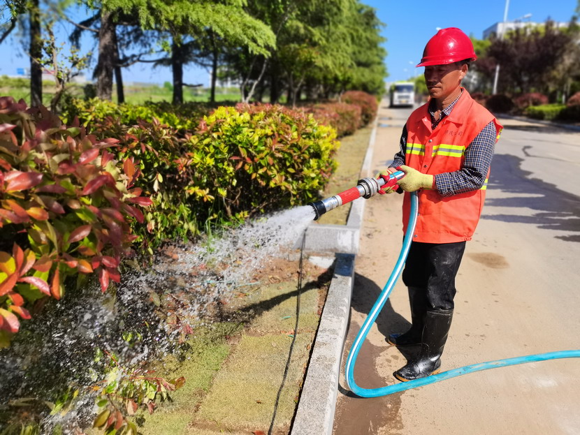 在各條基礎養(yǎng)護路段,綠化工人正在澆水,為花草樹木“解渴”。尤其是剛移植的苗木和剛出土的青苗,氣溫較高,容易造成脫水。通過適度澆水,保持土壤濕潤,促進植物根系吸收土壤中的養(yǎng)分,有助于生長和扎根,提高綠化成活率。
