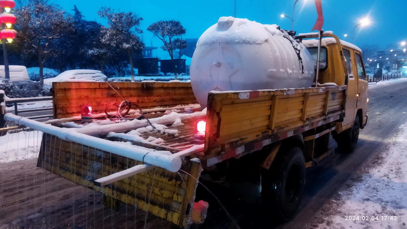 ? ? ? ? 今天(2月4日),港城普降暴雪,臺北華茂全員出動500余人次,大小機(jī)械100余臺(班),全力確保了轄區(qū)交通線暢通。這中間,出現(xiàn)一臺除雪“核武器”,這就是翔立分公司自制的鈣液噴淋除雪車。