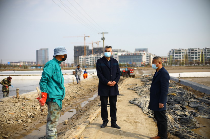 第一站來(lái)到海州灣公司昌圩班組。該班組4月1日礦鹵灌池,目前第四塊結(jié)晶池正在進(jìn)鹵,該公司三大組長(zhǎng)帶著各自隊(duì)伍都來(lái)支援,一起給新灌結(jié)晶池更換新塑苫布,大家忙的不亦樂(lè)乎。王董事長(zhǎng)首先慰問(wèn)大家,新冠疫情暴發(fā)以來(lái),海州灣公司廣大員工克服困難,一邊強(qiáng)化疫情防控,一邊加班加點(diǎn)抓生產(chǎn),雖然有的工作耽誤了,但是礦鹵灌池工作仍然趕在天時(shí)轉(zhuǎn)好之前進(jìn)行了。昨天進(jìn)鹵的結(jié)晶池底已經(jīng)鋪上了一層鹽,看起來(lái)甚是喜人。昌圩班組負(fù)責(zé)人,老先進(jìn)老黨員朱春年同志看到王董事長(zhǎng)來(lái)檢查工作,他也非常高興,和海州灣公司負(fù)責(zé)人劉天義一同聚攏過(guò)來(lái),與董事長(zhǎng)攀談,匯報(bào)工作。最后王董事長(zhǎng)強(qiáng)調(diào),一定要抓緊灌池,抓緊更換新塑苫布,打好“礦鹵復(fù)產(chǎn)”戰(zhàn),我們基礎(chǔ)產(chǎn)業(yè)牢固了,臺(tái)北的發(fā)展也就穩(wěn)固了。同時(shí),也不要忘記抓好疫情防控工作,職工集體工作時(shí)要保持一米線距離,保證不扎堆。劉天義、朱春年代表職工表態(tài),一定按照投資公司有關(guān)布置抓好各方面工作,一定拼命干,加油干,爭(zhēng)當(dāng)虎將打頭陣,當(dāng)好“臺(tái)北保衛(wèi)戰(zhàn)”主攻隊(duì)。