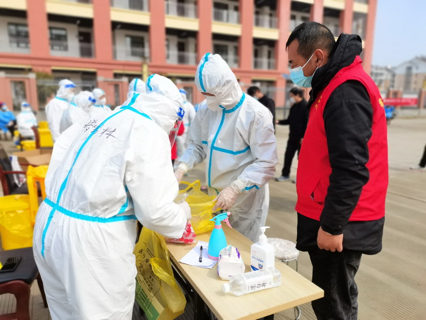 清晨6點(diǎn)30分,1號(hào)檢測(cè)點(diǎn),李明同志在檢查物資,“大白”服裝4套、“小藍(lán)”服裝6套、棉簽600根……;2號(hào)檢測(cè)點(diǎn),于洪亮在將物資上桌,病毒核酸檢測(cè)試管、棉簽、消毒液,“還缺少一瓶酒精,我立即反饋給社區(qū),請(qǐng)社區(qū)抓緊安排送來(lái)”;4號(hào)檢測(cè)點(diǎn),蘇玲、秦黎明正在互相幫忙穿好防護(hù)服,“秦姐,這個(gè)防護(hù)面罩里外有兩層薄膜,我給你撕掉,這樣就不會(huì)有霧氣了”,“嗯嗯,你這個(gè)拉鏈得拉到頂,我們自己也一定要做好防護(hù)”秦黎明溫柔的說(shuō);5號(hào)檢測(cè)點(diǎn),內(nèi)退黨員孫芳和姜海洋,互相在防護(hù)服后背寫(xiě)上對(duì)方的名字,以便于更高效的完成檢測(cè)工作;6號(hào)檢測(cè)點(diǎn),霍正鋼、朱文健、韓永剛、邱榮濱正在清點(diǎn)檢測(cè)小卡片;7號(hào)檢測(cè)點(diǎn),張強(qiáng)在拿著酒精給廢物處置垃圾箱消毒;8號(hào)檢測(cè)點(diǎn),新加入的孫銀、占恒春、尹永明、韓永光、趙紹慶正在給消殺噴霧劑灌裝84消毒液,社區(qū)8個(gè)檢測(cè)點(diǎn)的消殺工作全部由昌圩臨時(shí)黨支部志愿者負(fù)責(zé)。