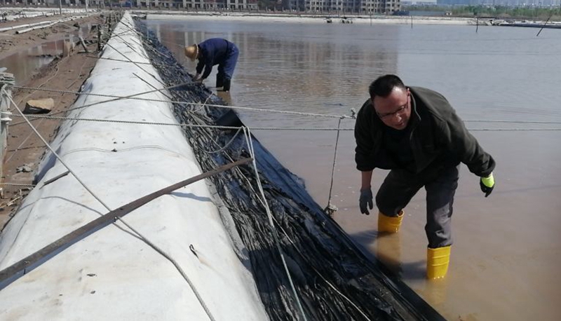 復(fù)曬灘上,昨天冰雹造將擋浪布擊的千瘡百孔,為了保住勞動成果,天還未亮?xí)r,翔立人就走上灘頭進(jìn)行搶修更換,以確保利用好天時退布復(fù)曬生產(chǎn)高濃度鈣液,實(shí)現(xiàn)鈣業(yè)的產(chǎn)銷再創(chuàng)新高。