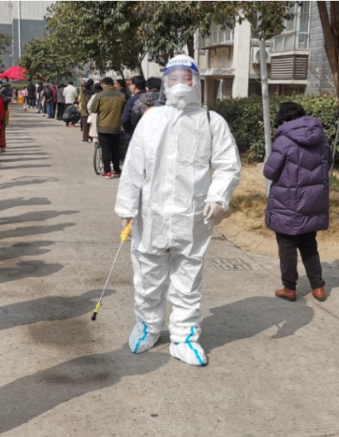? ?黨員尹永明,穿好防護(hù)服,帶上手套,口罩和防護(hù)眼鏡,背上30多斤的便攜式噴射器全身“武裝”,變成“大白”開(kāi)始了一天的工作,從早上7點(diǎn)開(kāi)始“打起精神努力干”到下午1:30“拖著疲憊的雙腿結(jié)束”。