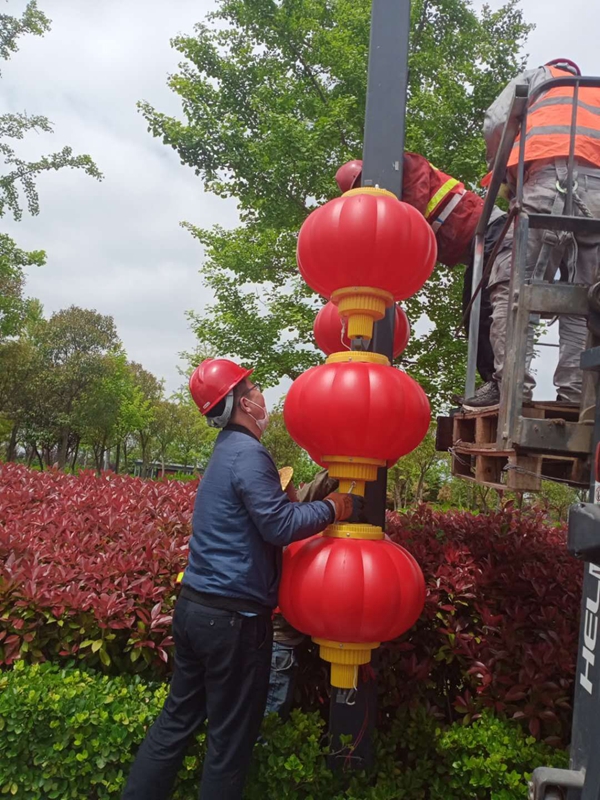 施工現(xiàn)場,大家配合默契利用小型叉車進行輔助拆除作業(yè),五分鐘不用一個燈籠就拆除完成。這邊完成拆除部分,那邊負(fù)責(zé)還原以及運送回收。由于燈籠的不可收攏性,同時為避免造成二次污染,對于拆下來的燈籠及時進行運送和回收保存,確保第二年要安裝的時候重復(fù)利用。