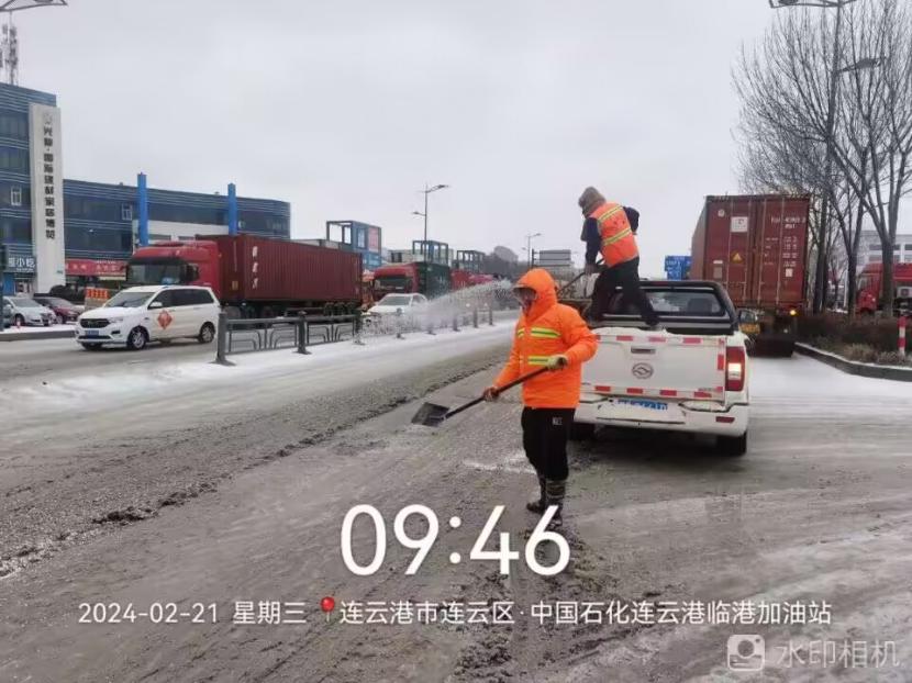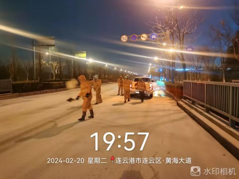 夜晚10點(diǎn),在黃海大道,支部書記范曉寶親自帶隊(duì),帶領(lǐng)張巖、盛小雷、薛加兵等6名黨員,冒雪奮戰(zhàn)、連續(xù)作業(yè),拋撒融雪劑,進(jìn)行緊急除雪除冰作業(yè)。