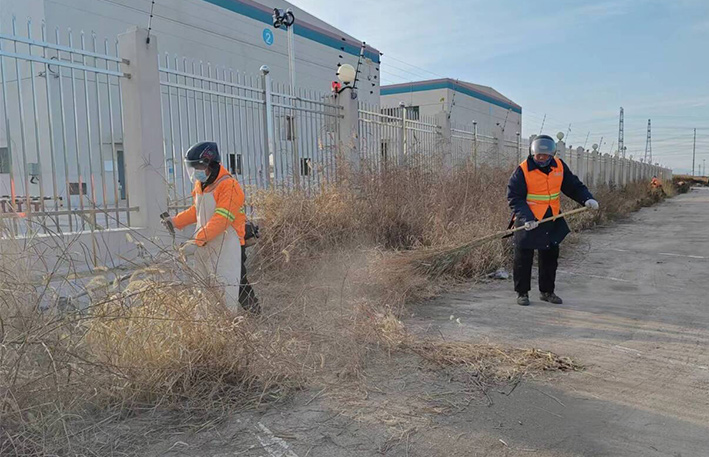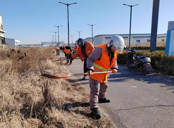 該分公司園區(qū)兩個班組近35名保潔勇士,無懼低溫刺骨天氣,匯聚石化十路、石化三道道路兩側(cè)。勞動現(xiàn)場,黨員骨干示范帶頭作用處處體現(xiàn)。石峰、朱海勇、楊靜身背幾十斤重打草機,無所怨言,持續(xù)工作時長達(dá)三個多少時。在他們的帶動下,班組人員一字排開,分工明確,各負(fù)其責(zé)。