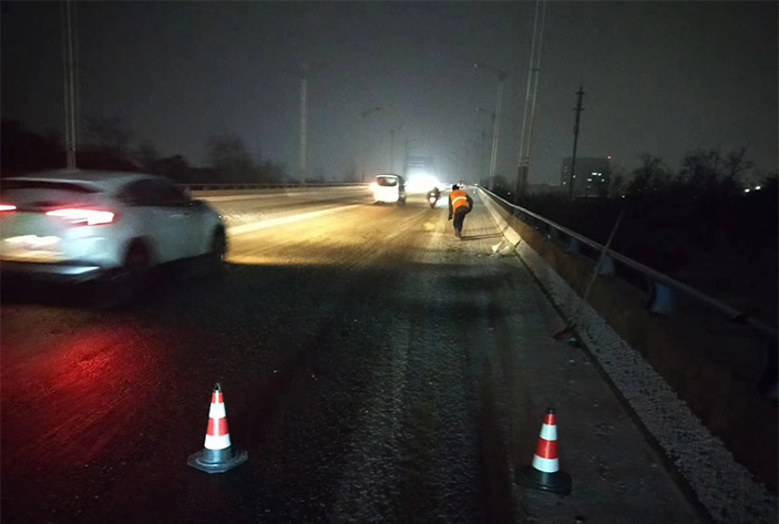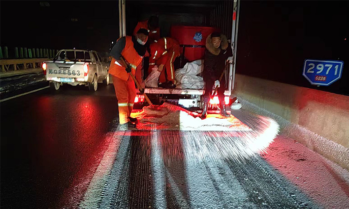 該公司除雪突擊隊(duì)由總經(jīng)理徐習(xí)華和副總王利分頭帶隊(duì)指揮,集結(jié)了安全部、管養(yǎng)部、綠化、保潔、市政、環(huán)衛(wèi)的突擊隊(duì)員80余名,出動(dòng)5輛皮卡車、3輛皮卡、1臺(tái)裝載機(jī)和2輛巡查車,主要負(fù)責(zé)新區(qū)內(nèi)橋梁、連云開發(fā)區(qū)橋梁、徐新路、疏港大道、228省道等主要交通干道布撒融雪劑抗凍救災(zāi)工作。突擊隊(duì)員在進(jìn)行融雪劑撒布作業(yè)的同時(shí),及時(shí)清理路面融化雪水,防止再次結(jié)冰,各除雪設(shè)備配合作業(yè),階梯式向前推進(jìn),提高除雪效率。(李敏 王宜全)