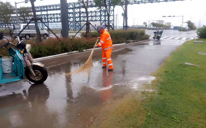 該分公司9個(gè)班組人員,在公司統(tǒng)一安排下,按時(shí)到達(dá)指定道路保潔路段。在班長(zhǎng)的帶領(lǐng)下,不停的排查清理路面各類垃圾,揮動(dòng)手中大掃把,清理道路積水30多處,徒手清倒果皮箱200多個(gè),20臺(tái)大中型清掃車輛安全有序趕赴指定清掃路線,加滿車廂用水,工作臺(tái)班達(dá)40余個(gè)?,F(xiàn)場(chǎng)工作中黨員先鋒示范引領(lǐng)一路彰顯,人工清理路障石塊20多塊,清理上海路大風(fēng)刮落梧桐落葉,樹枝30多袋,工作時(shí)長(zhǎng)達(dá)4個(gè)多時(shí),風(fēng)雨中愛崗敬業(yè)畫面處處體現(xiàn),有力保障雨中新城道路環(huán)境整潔靚麗。(楊波)